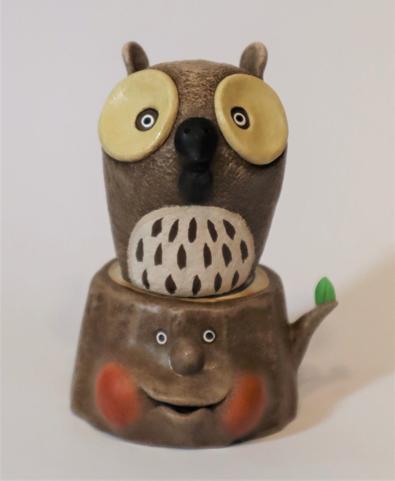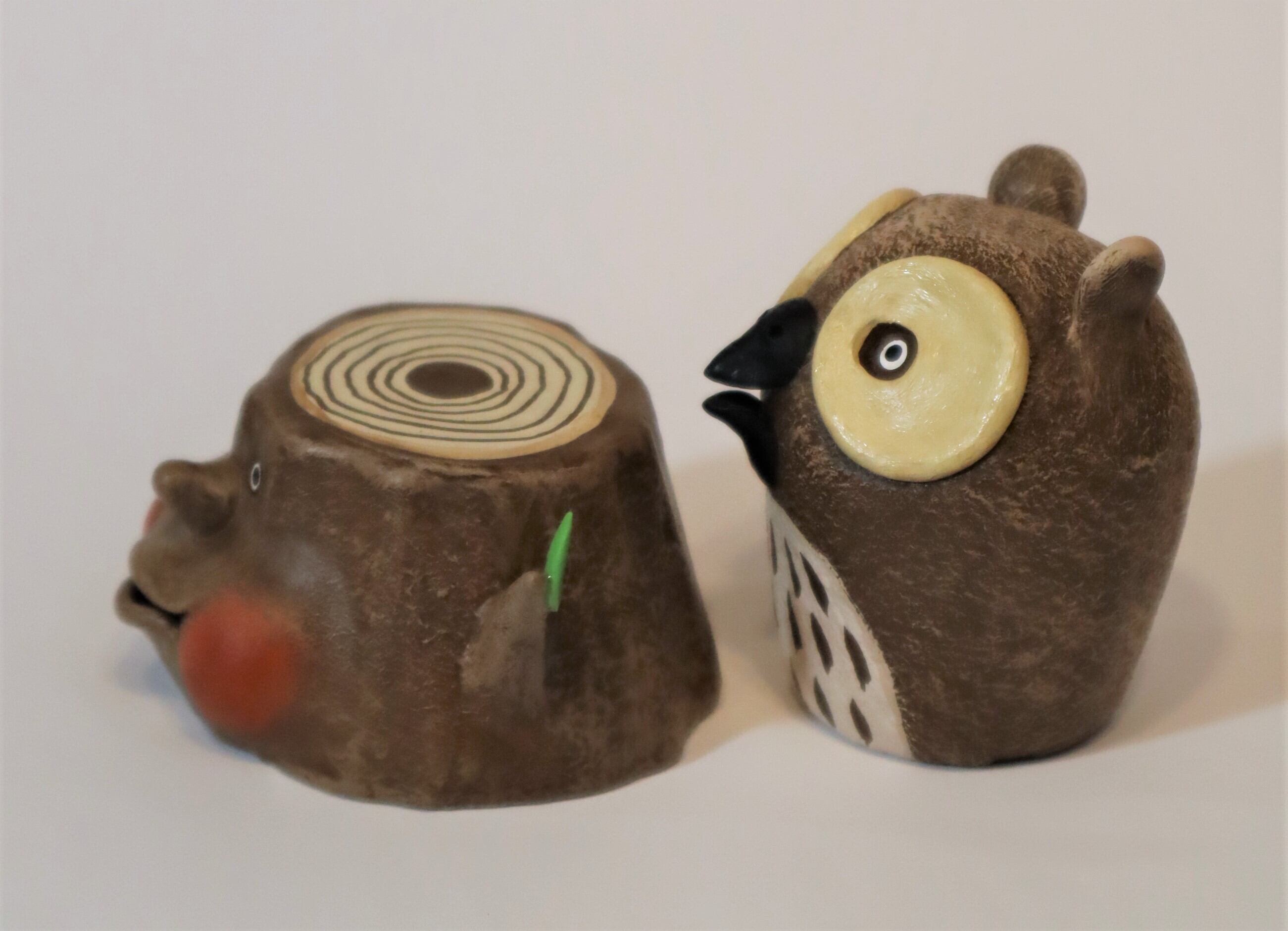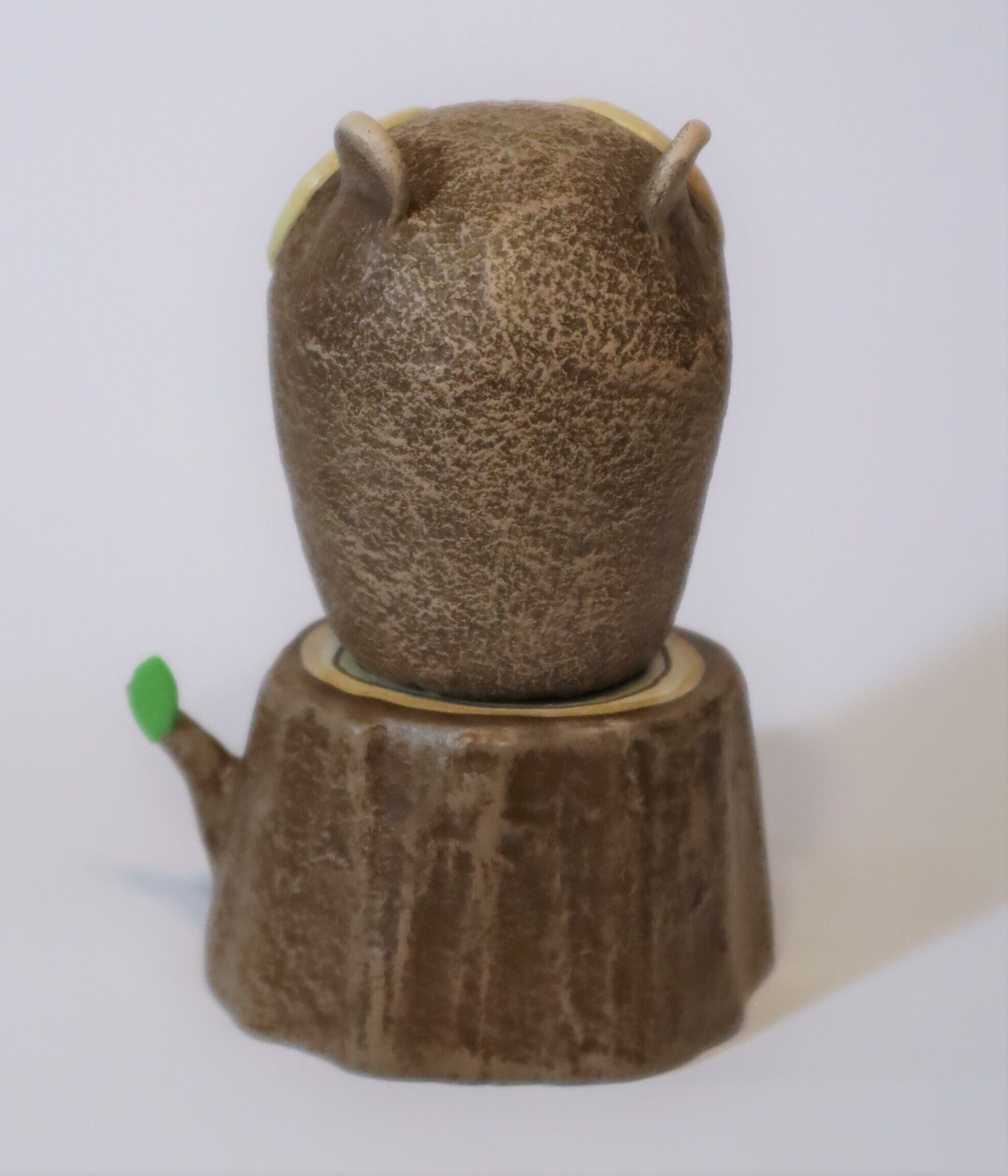 ミミズクの身長は約5.7センチ、切り株の身長は約3.5センチです。