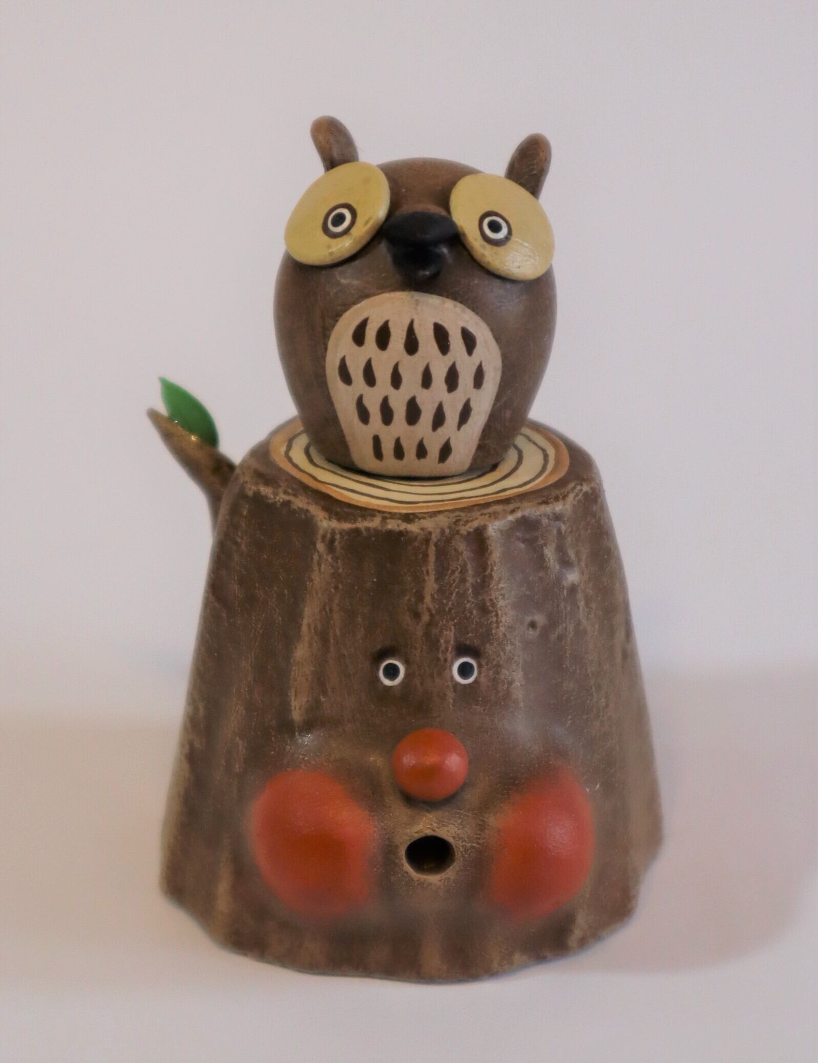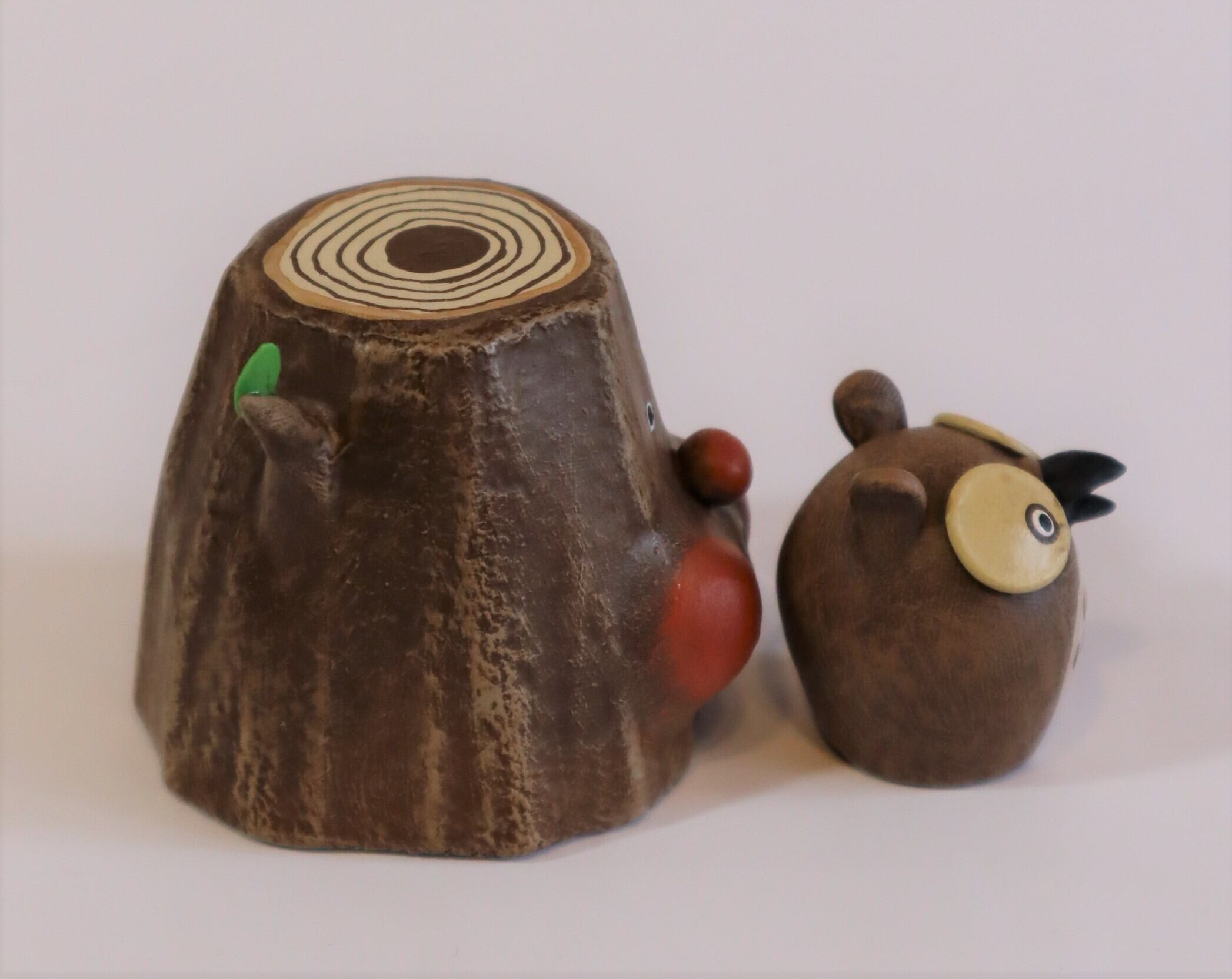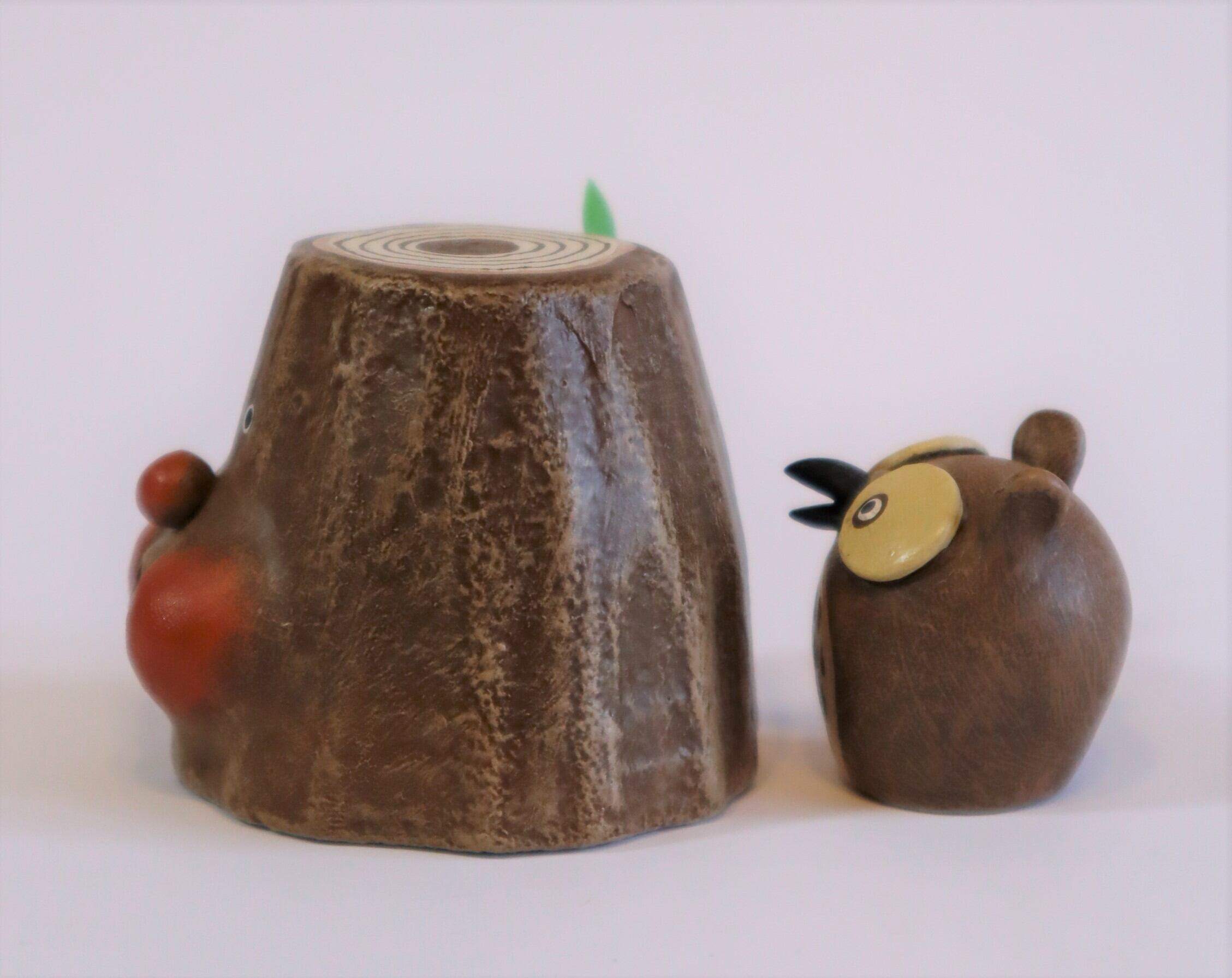 ミミズクの身長は約3センチ、切り株の身長は約4。5センチです。